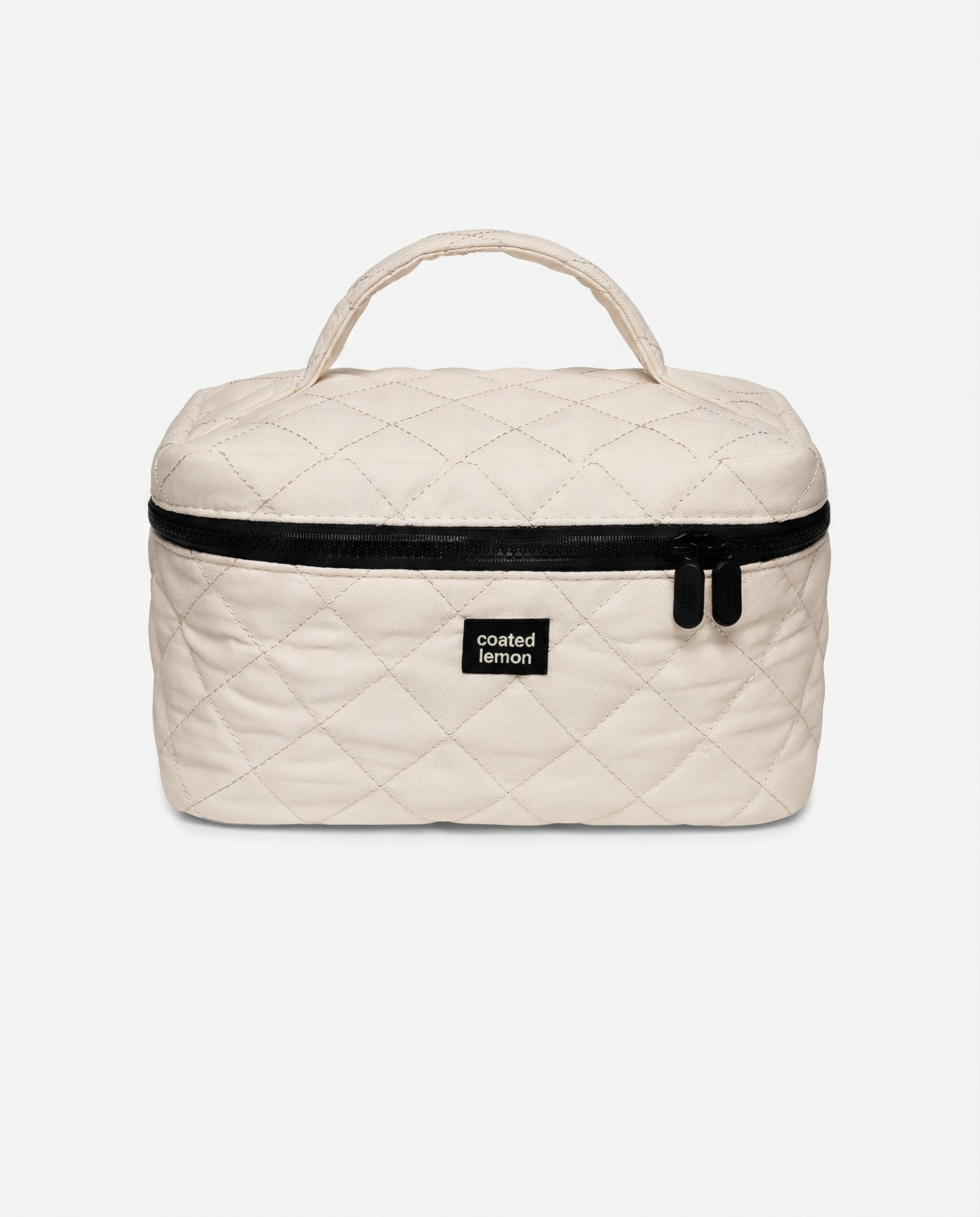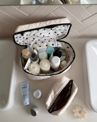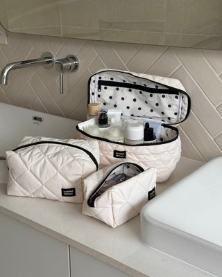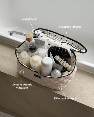 Beige Toalettmappe i slitesterkt materiale med sorte detaljer og print med sorte polkadotter på innsiden. Stoffet på innsiden og utsiden av toalettmappen er vannavstøtende. Sømløst fôr, vattert med padding og solid glidelås.
