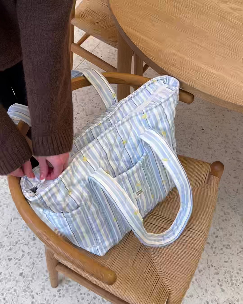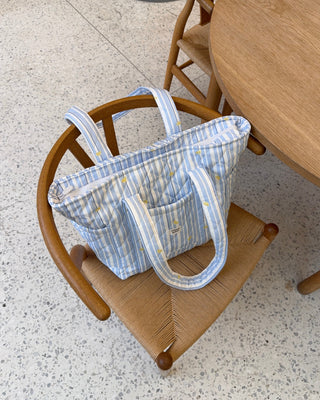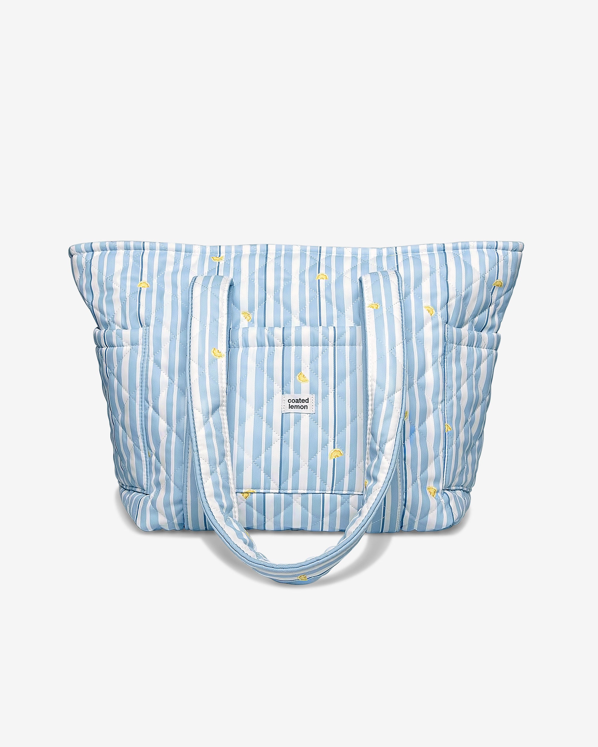 Skulderveske i slitesterkt materiale med blå striper og sitroner og et blått stoff på innsiden. Tre praktiske lommer på forsiden og sidene av vesken, og tre på innsiden. Sømløst fôr, vattert med padding og solid glidelås. Stoffet utenpå er vannavstøtende.