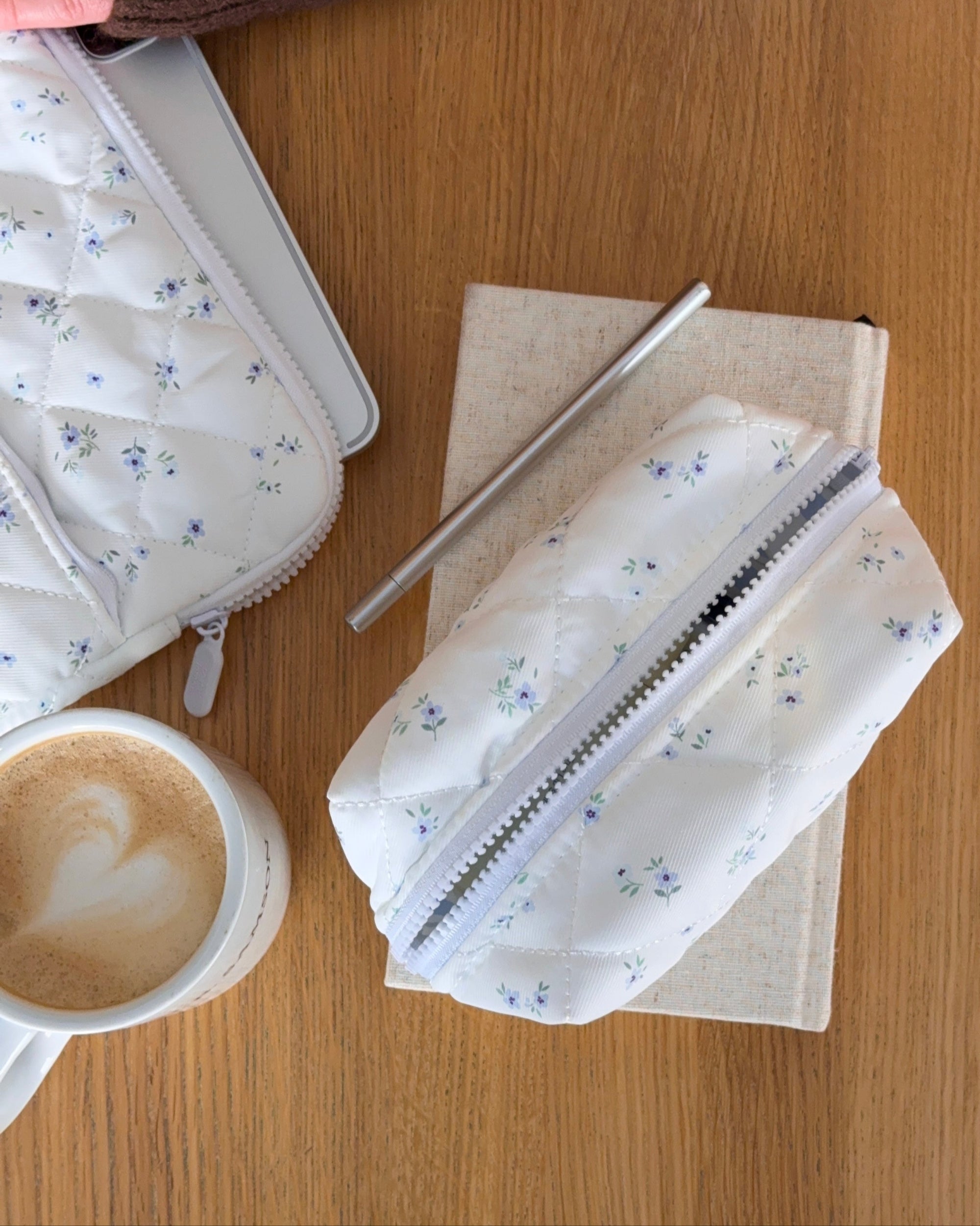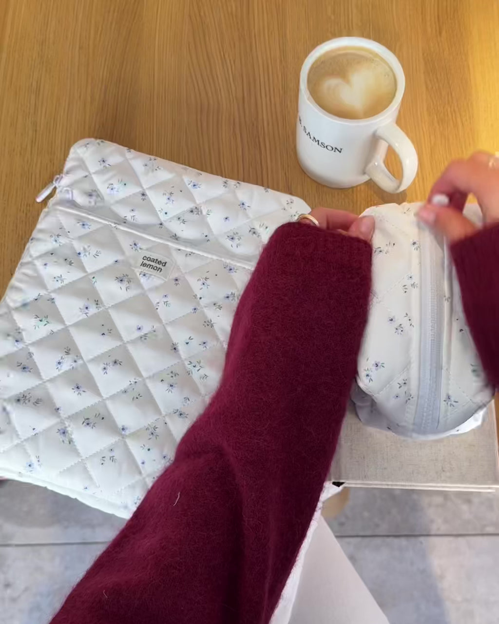 iPad Mappe i slitesterkt materiale med blomsterprint, og striper i blå og grønn på innsiden. Praktisk lomme på forsiden. Sømløst fôr, vattert med padding og solid glidelås.