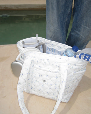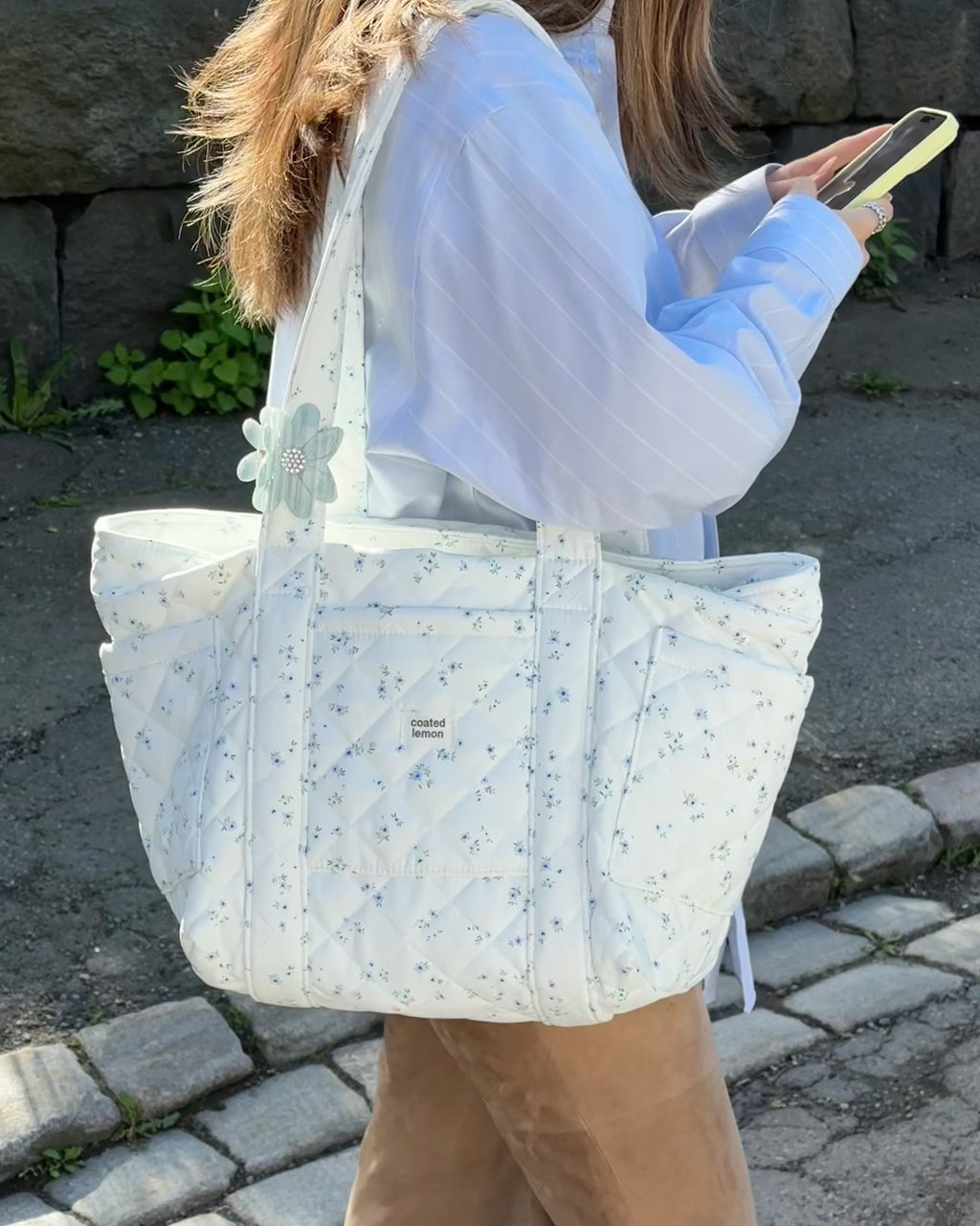 Skulderveske i slitesterkt materiale med blomsterprint, og striper i blå og grønn på innsiden. Tre praktiske lommer på forsiden og sidene av vesken, og tre på innsiden. Sømløst fôr, vattert med padding og solid glidelås.