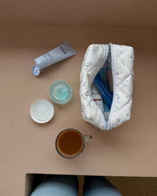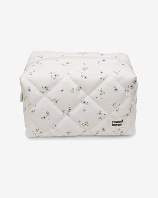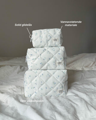 Toalettmappe i slitesterkt materiale med blomsterprint, og striper i blå og grønn på innsiden. Stoffet på innsiden og utsiden av toalettmappen er vannavstøtende. Sømløst fôr, vattert med padding og solid glidelås.