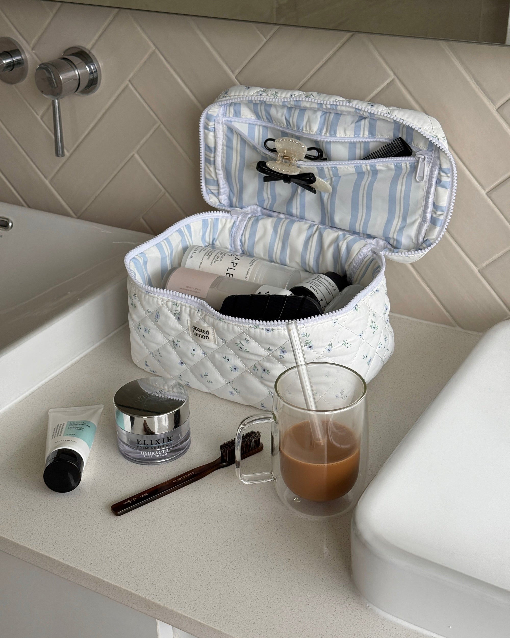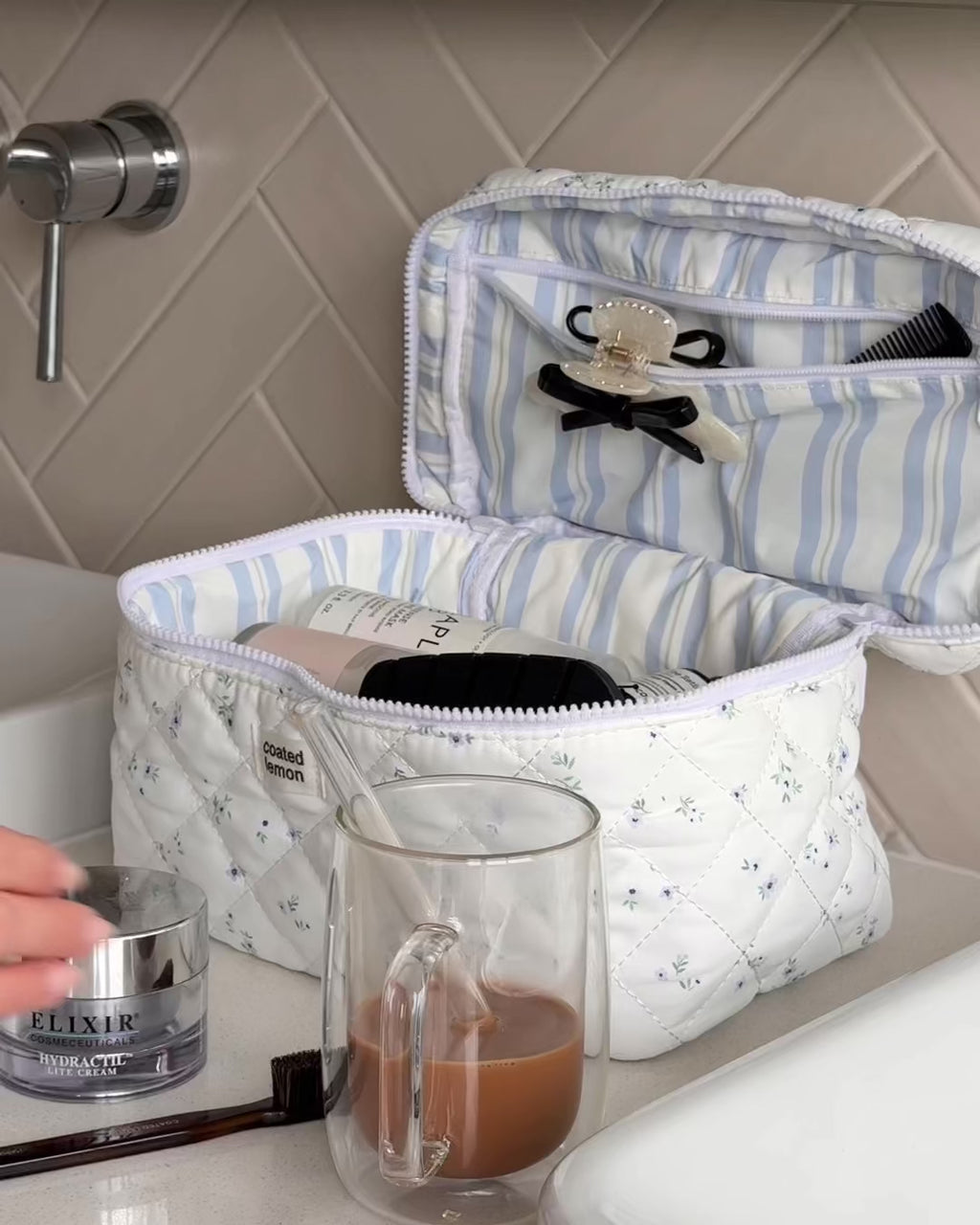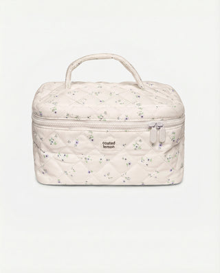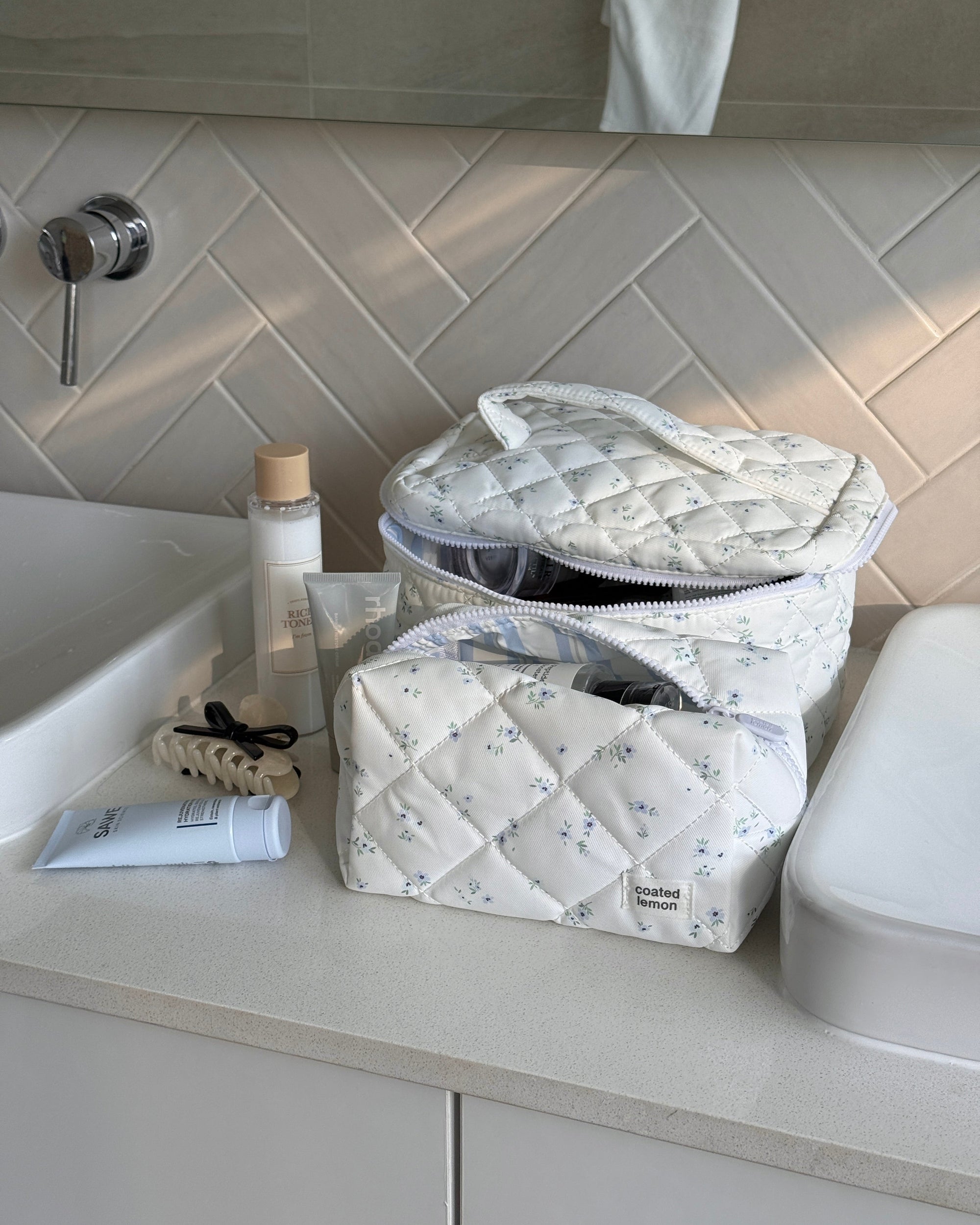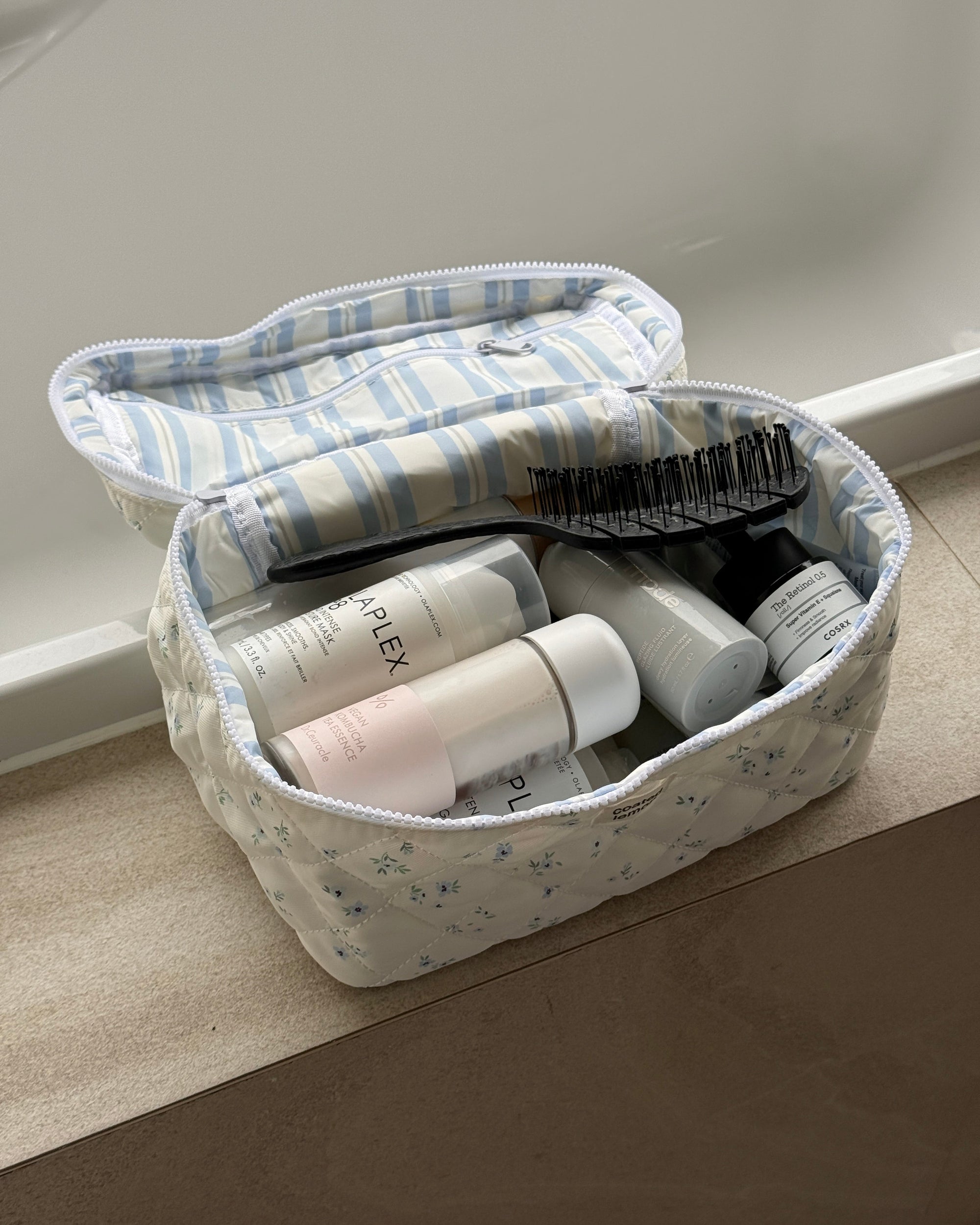 Toalettmappe i slitesterkt materiale med blomsterprint, og striper i blå og grønn på innsiden. Stoffet på innsiden og utsiden av toalettmappen er vannavstøtende. Sømløst fôr, vattert med padding og solid glidelås.