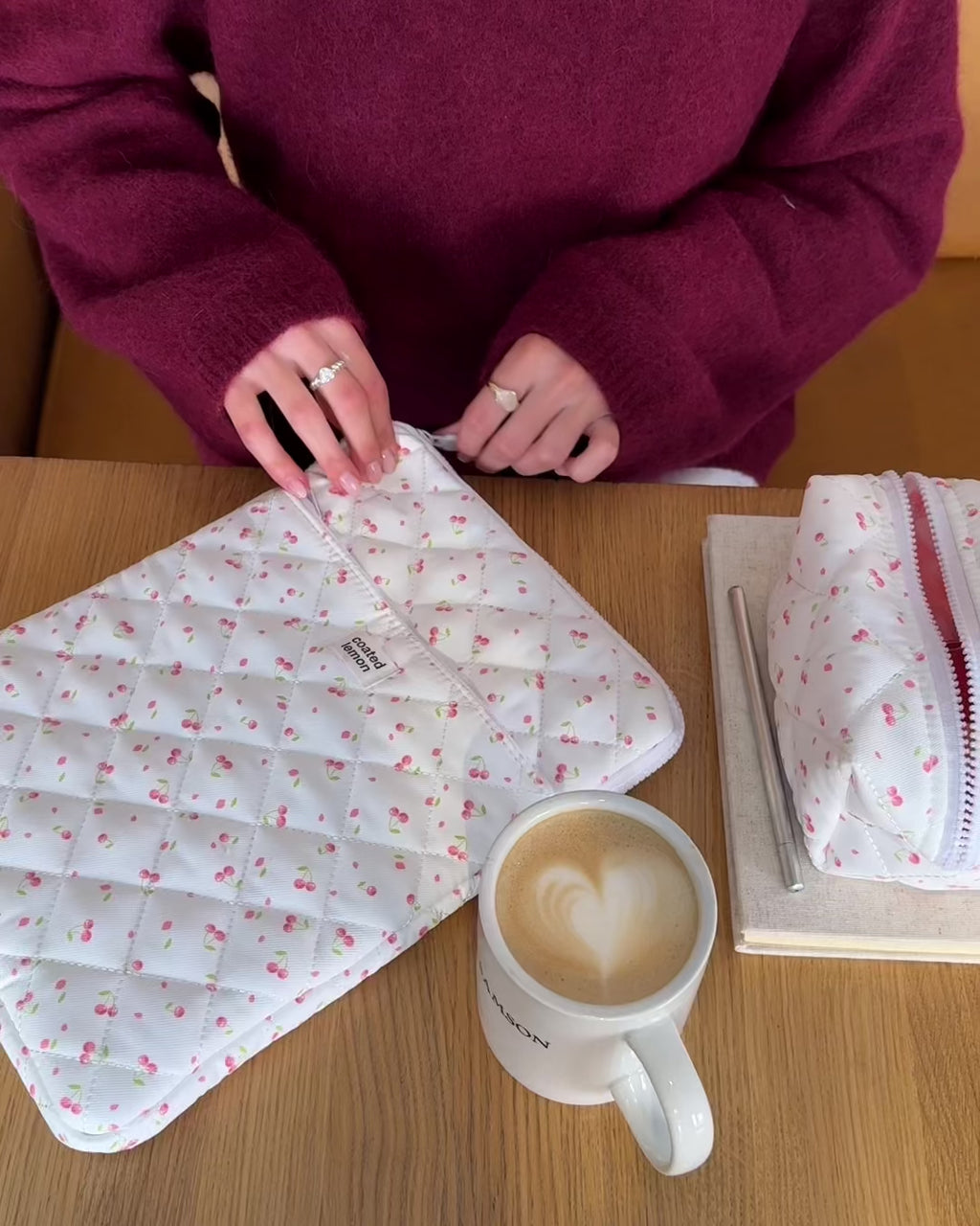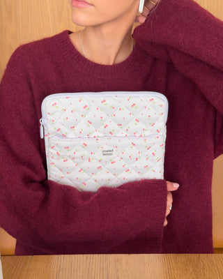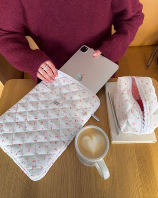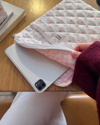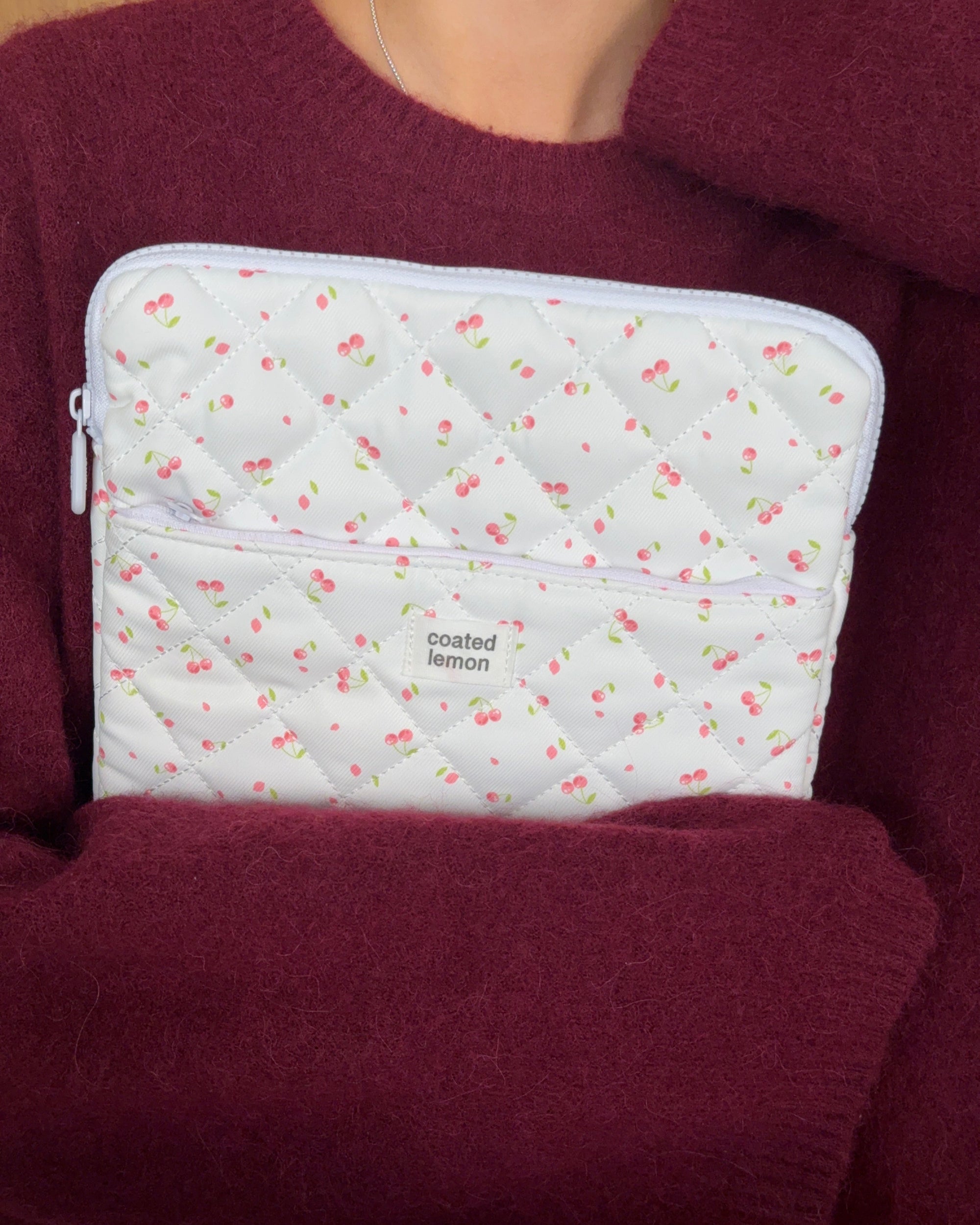iPad Mappe i slitesterkt materiale med cherry print og et rutete, rosa stoff på innsiden. Praktisk lomme på forsiden. Sømløst fôr, vattert med padding og solid glidelås.