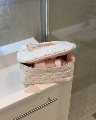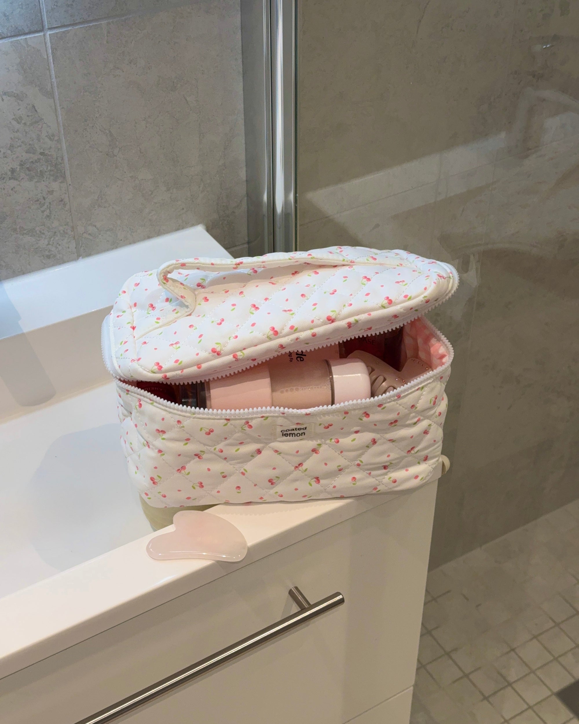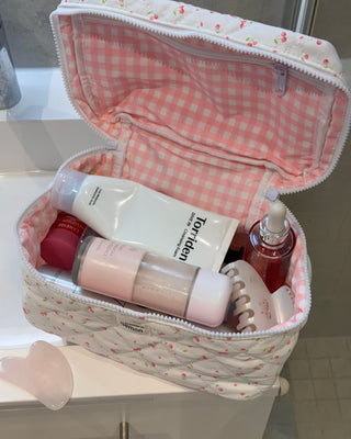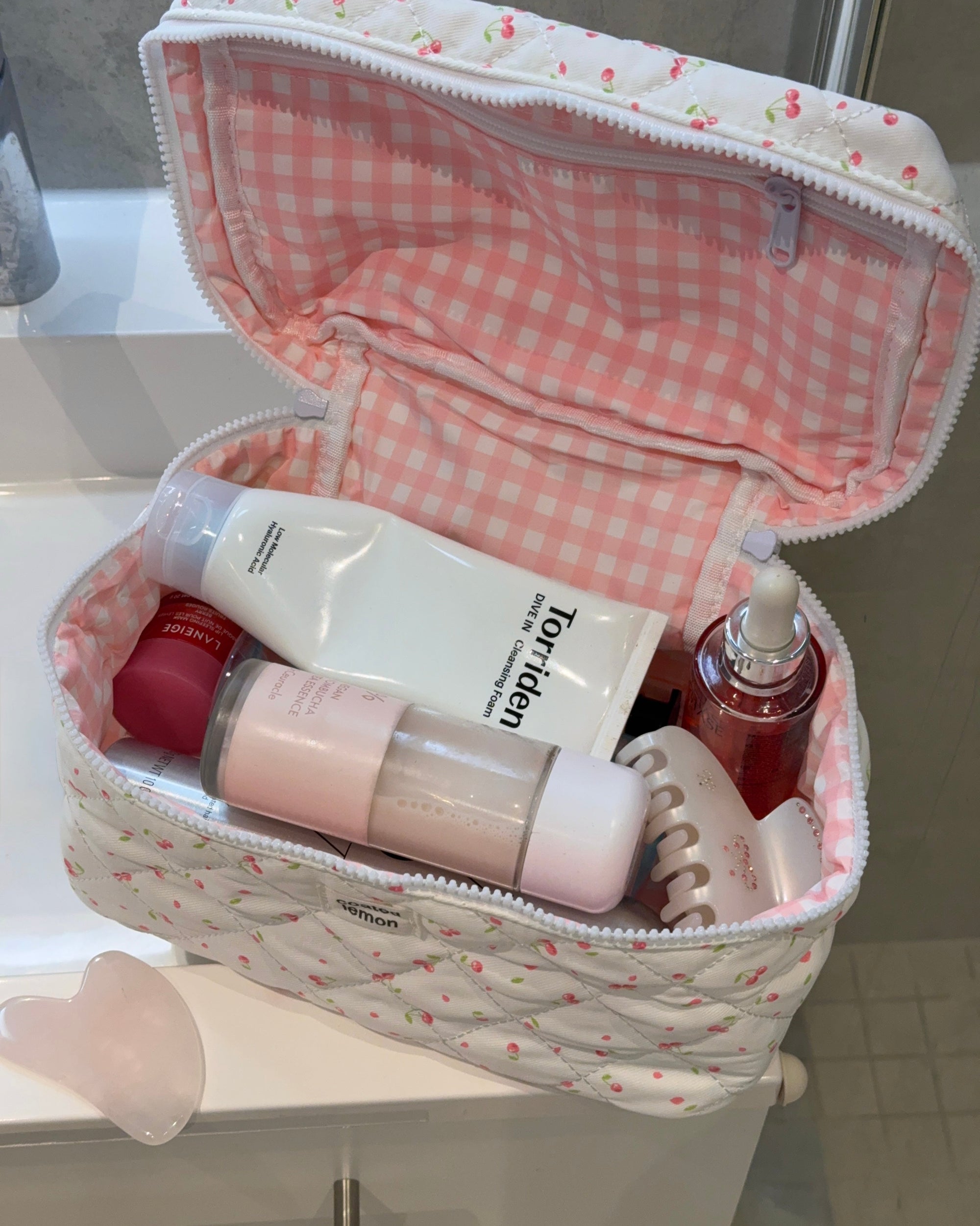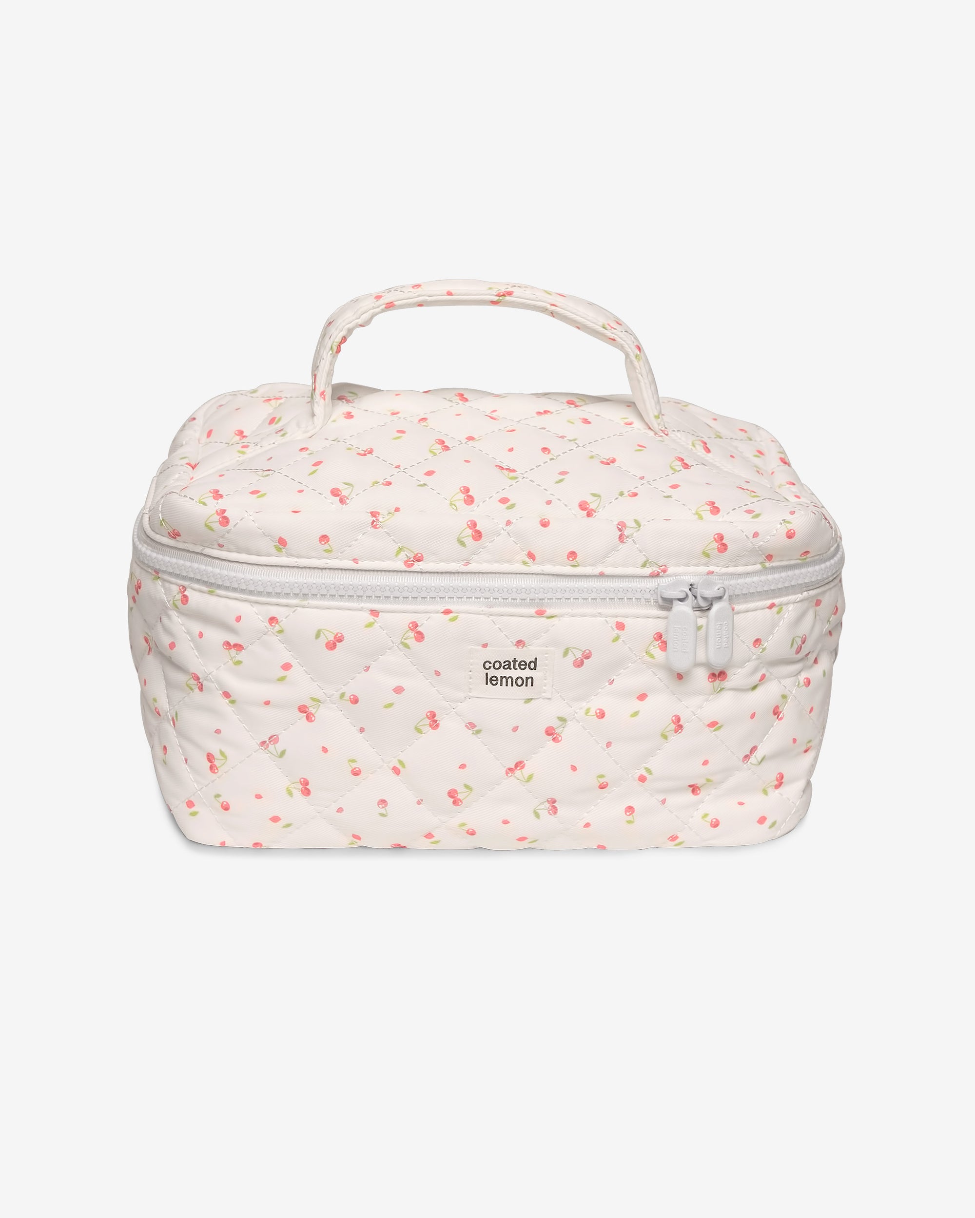 Toalettmappe i slitesterkt materiale med cherry print og et rutete, rosa stoff på innsiden. Stoffet på innsiden og utsiden av toalettmappen er vannavstøtende. Sømløst fôr, vattert med padding og solid glidelås.