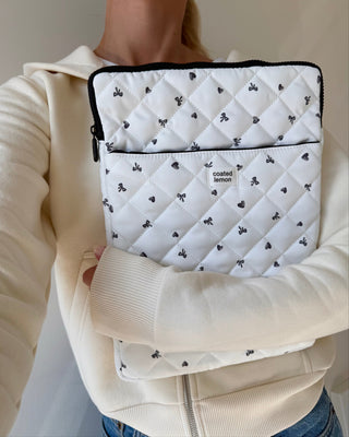 PC Mappe i slitesterkt materiale med svarte hjerter og sløyfer, og et rutete stoff på innsiden. Praktisk lomme på forsiden. Sømløst fôr, vattert med padding og solid glidelås.